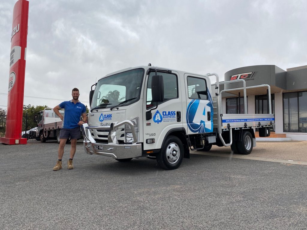 “First class, A-Class!” Johno Sinclair and A Class Electrical Contractors give their brand new NNR 45-150 Traypack Crew a resounding cheer, pictured here at the Mildura Truck Centre Isuzu saleyard. Specialising in all things electrical, from rural works to residential services around the Mildura region, A Class needed a workhorse tough enough to withstand the daily grind while giving the crew a comfortable ride to and from jobs. They found just what they needed in the NNR Traypack Crew, featuring a handy GVM of 4,500 kg (which allows for multiple drivers), a heavy-duty aluminium tray and Isuzu’s Automated Manual Transmission with torque converter (TC-AMT). We give A Class top marks for practicality and bonus points for that slick custom wrap.