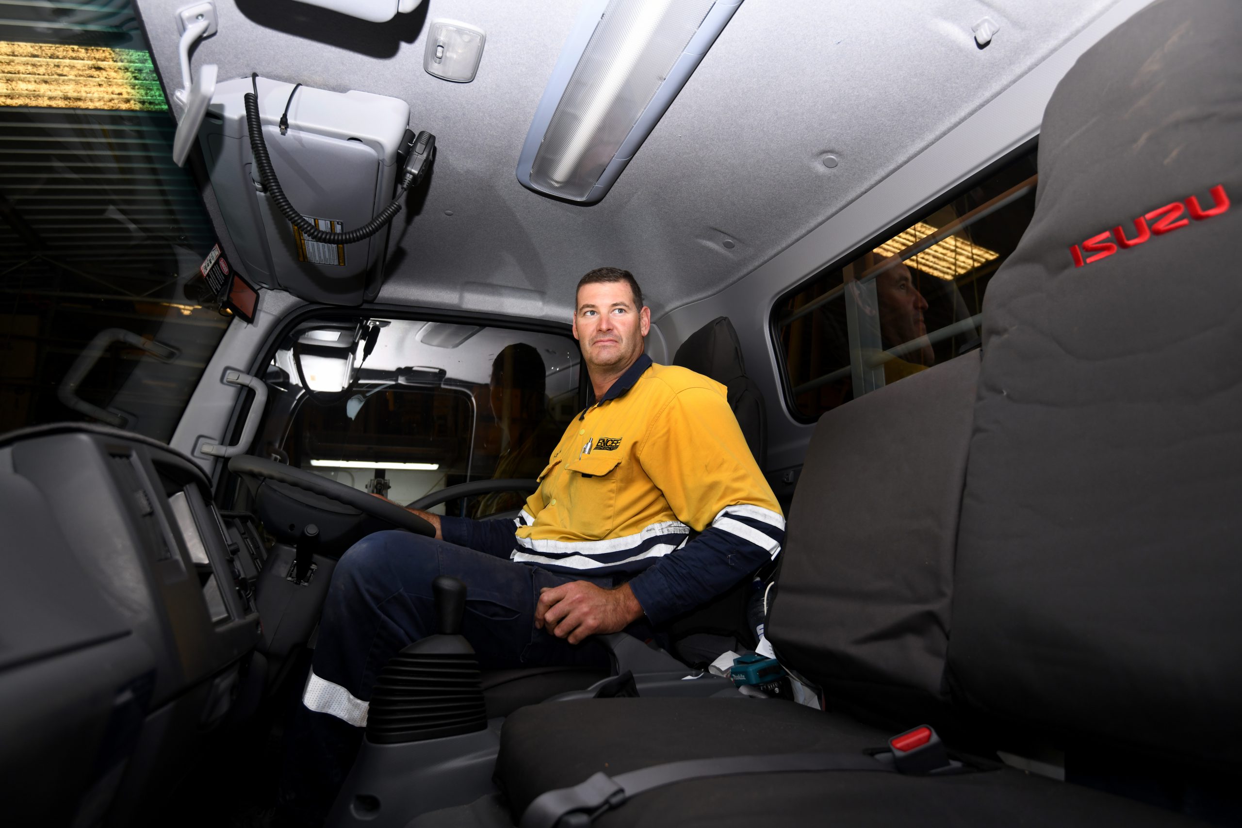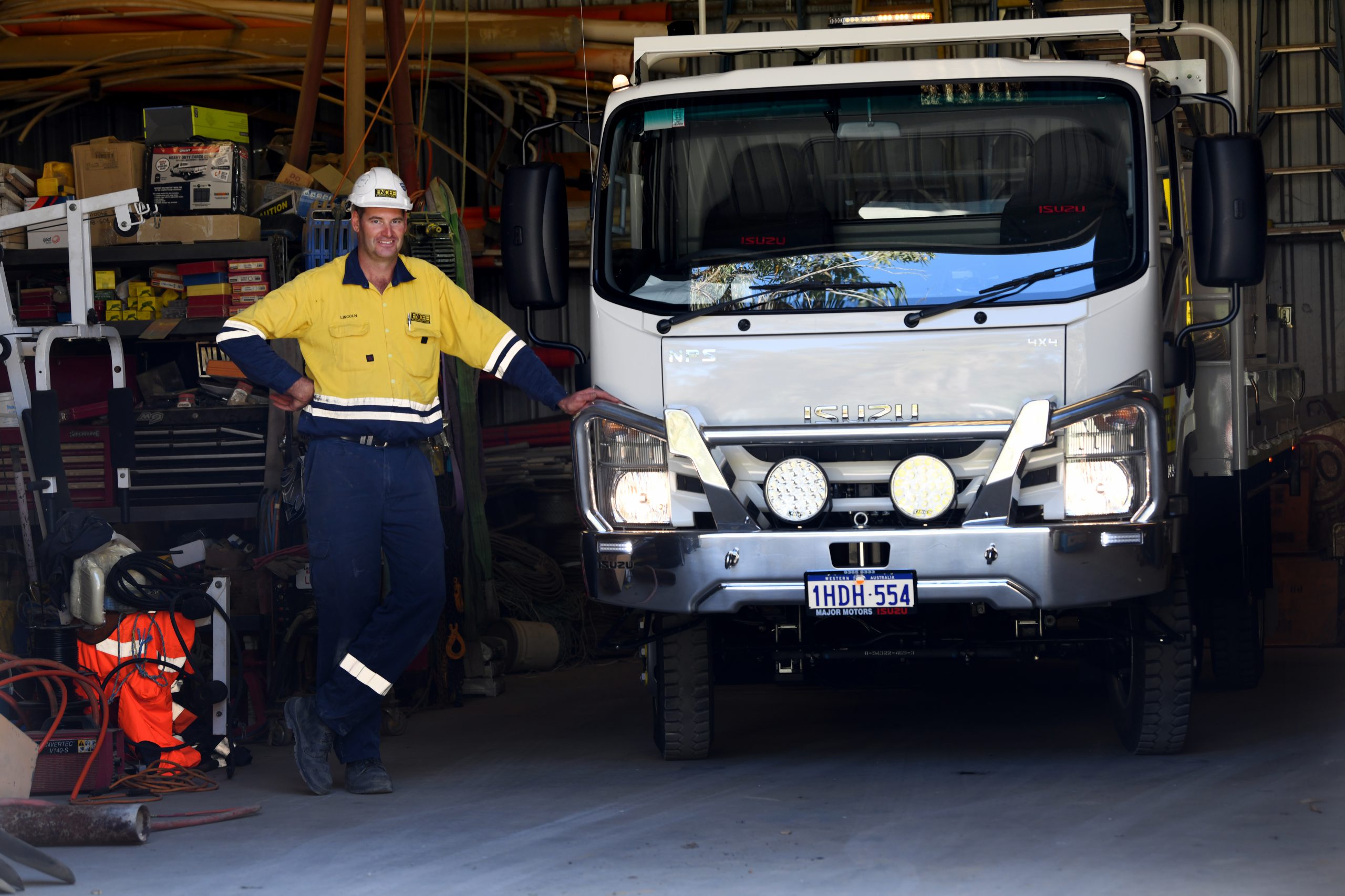 At six feet, ten inches tall, Lincoln is actually joking about the NPS 4x4’s best features. Posted against the 2.49 metre cab of their 2020 NPS 75-155, he makes the Isuzu off-roaders look comparatively miniscule. The supercharged size of outback diggers in the background don't help either.