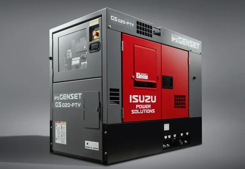 The GS020-PTY generator set has a rated output of 20 kVA / 16 kWe (Prime) and is powered by a four-cylinder Isuzu 4LE1 engine, with a compact footprint suited to mobile applications.